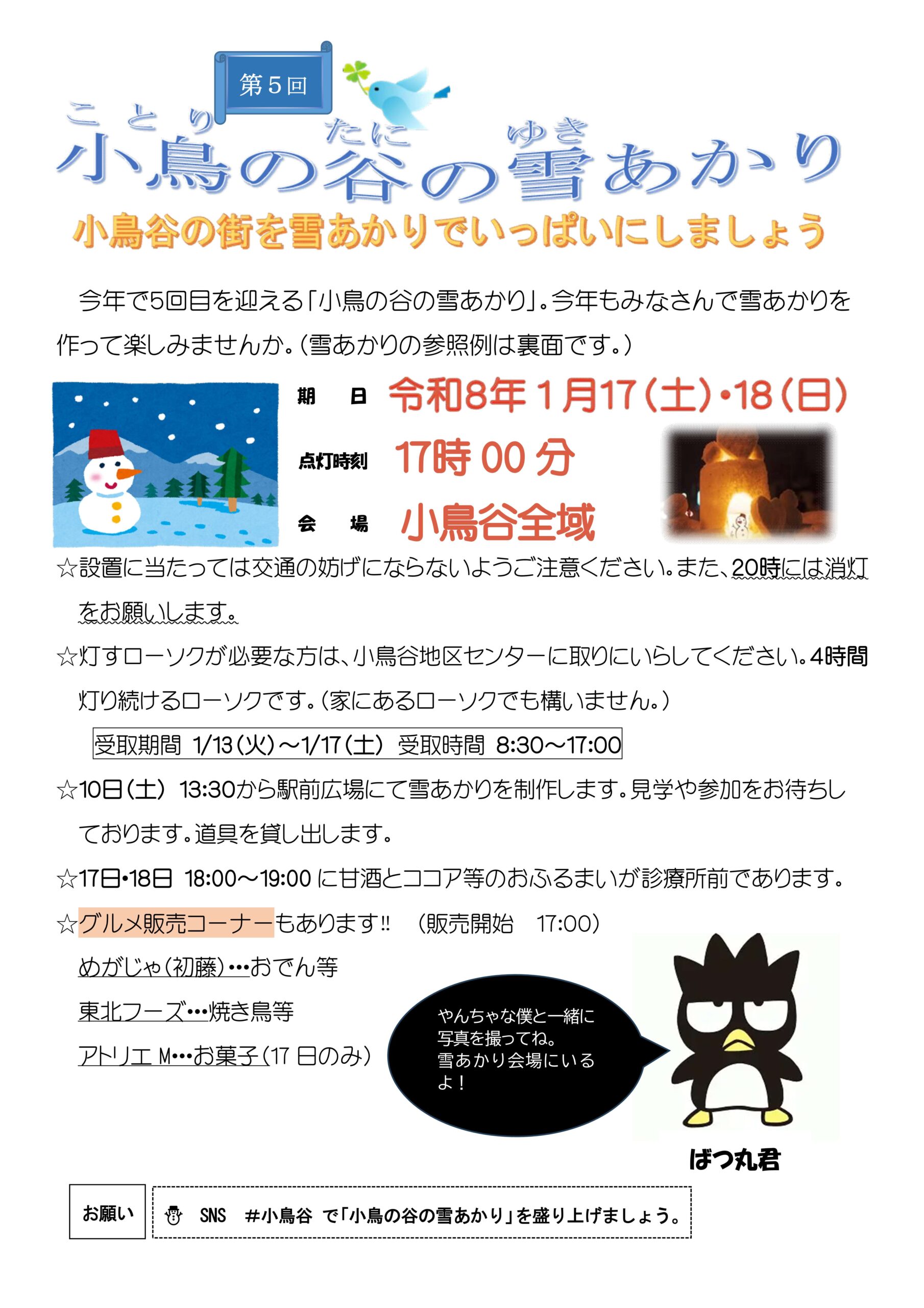 | 会場 | 小鳥谷地区全域…雪あかり点灯 小鳥谷診療所前…甘酒のおふるまい おでん、焼き鳥、お菓子等の販売 ※お菓子の販売は17日のみ |