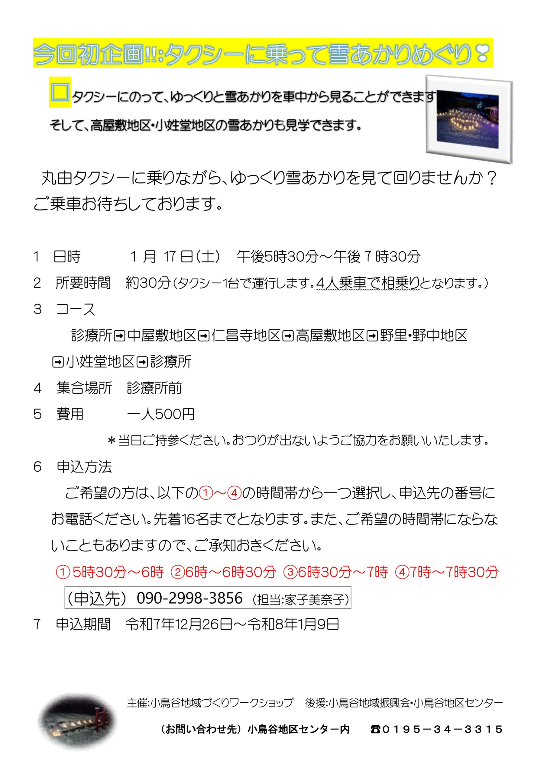| お問合せ | 小鳥谷地域づくりワークショップ雪あかり(小鳥谷地区センター内) 0195-34-2111 |