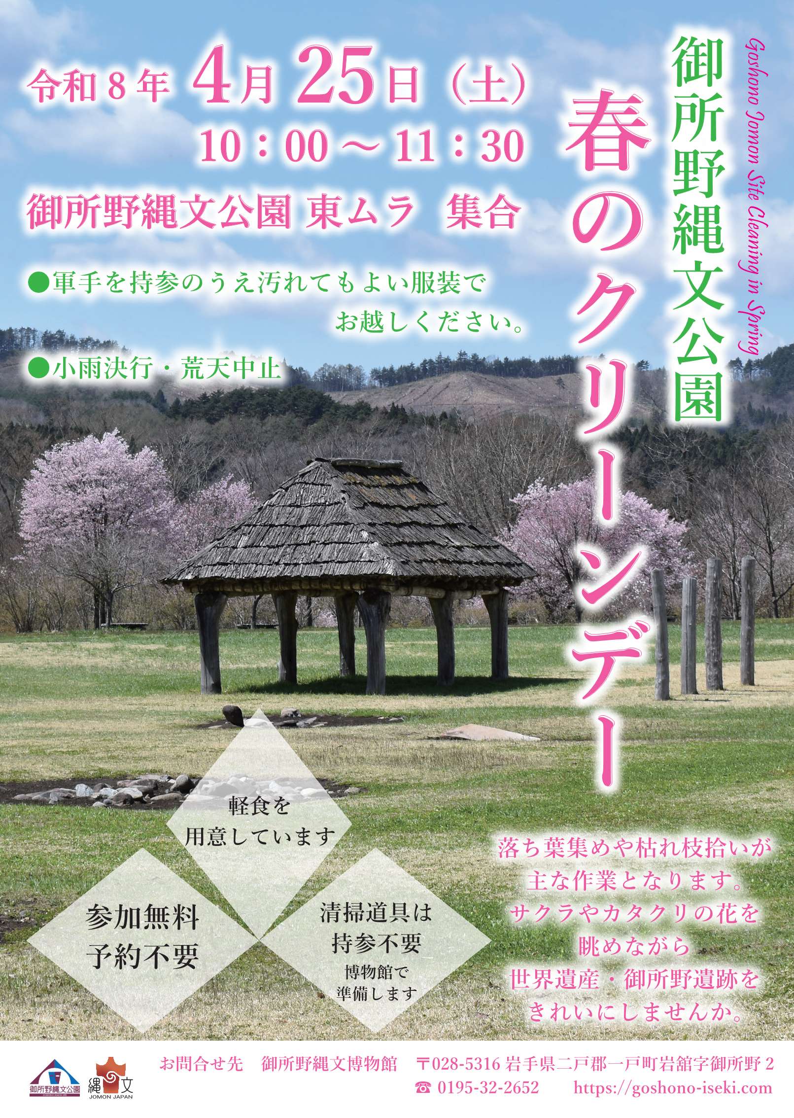 4/25(土)、御所野縄文公園において「春のクリーンデー」が開催されます👏